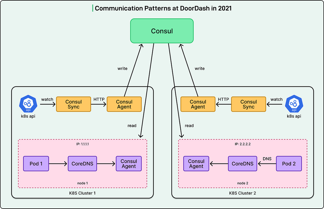 The resulting service topology had become increasingly complex, making system-wide visibility and debugging extremely difficult. The GoalsWhen it came to implementing the Service Mesh for their architecture, the DoorDash engineering team started with modest goals. Before the move to Service Mesh, their multi-cluster service discovery architecture looked like this: