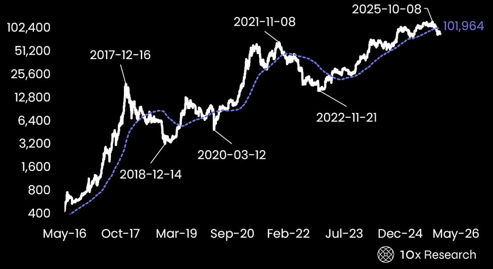 Why this report matters While our near-term stance remains bearish, the coming year will present a compelling buying opportunity ahead of a larger upside move into late 2026, 2027, and 2028. We approach this view with realism, based on our analysis, rather than wishful thinking. In the near term, multiple headwinds remain, encompassing technical signals, market structure, capital flows, and on-chain data. However, these dynamics are likely to be resolved over the course of next year. Below, we outline a roadmap that identifies potential downside targets, the timing (tradeable tactical peaks & bottoms), drivers of short-term cyclical rallies, and how to trade those moves. In the early stages, the environment is likely to remain a trader’s market, as it has been for several months, with tight risk management required following the late-October regime shift. While this trading-oriented phase should persist initially, we expect the market to ultimately form a bottom earlier than traditional cycle analysis would suggest, setting the stage for the next major advance. When we identified the cycle low in late October 2022, the prevailing sentiment was one of capitulation; most participants were dismissive and had effectively given up. We expect a similar backdrop when the next bottom is established ahead of the 2026 inflection point, just before a new 2–3 year bull market begins. Bitcoin peaks vs. its 1-year moving average Subscribe to 10x Research Market Updates to unlock the rest.Become a paying subscriber of 10x Research Market Updates to get access to this post and other subscriber-only content. A subscription gets you: