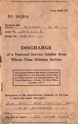 file Army Book 111. Discharge of a National Service Soldier from Whole-Time Military Service. War Office WELSH, AS, 22095612 Royal Armoured Corps, 13th/18th Royal Hussars. AT2025.11.9 19490106 19500710 https://www.patreon.com/posts/148838712/