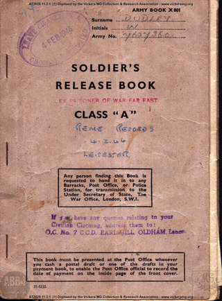 file Papers. William Dudley, Royal Army Ordnance Corps, Royal Electrical and Mechanical Engineers 7627360 AT2025.11.2 1945-1946 item Army Book X801. Soldier's Release Book. Class "A". War Office Dudley, W, 7627360. Ex Prisoner of War Far East. REME. AT2025.11.2.1 19400418 19460122 item Interrogation Certificate. Ex Prisoner of War War Office 7627360, Private William Dudley, ROAC. AT2025.11.2.2 19450920 item Army Form X202/B. Certificate of Transfer to the Army Reserve. War Office 7627360, Craftsman DUDLEY, William AT2025.11.2.3 19460212 https://www.patreon.com/posts/148837335/