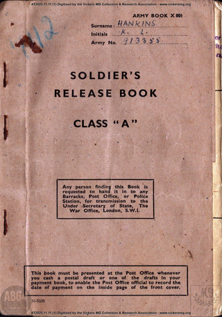 file Army Book X801. Soldier's Release Book. Class "A". War Office HANKINS, KL, 913855. 53rd (FD) Holding Regt, Royal Artillery. AT2025.11.11 19390503 19460315 https://www.patreon.com/posts/148839400/