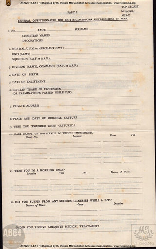 file Questionnaires. Prisoners of War returning and War Crimes. AT2025.11.4.2 1945 https://www.patreon.com/posts/148838320/ item MI9/Gen MIS-X. General Questionnaire for British/American Ex-Prisoners of War. Military Intelligence 9 AT2025.11.4.2.1 1945 https://www.patreon.com/posts/148838320/ item S. 59. Ex-Prisoners of War. Adjustment of Accounts. War Office AT2025.11.4.2.2 1945 https://www.patreon.com/posts/148838320/ item MI9/INT/Q MIS-X. War Crimes. Military Intelligence 9 Information supplied by ex-Prisoners of War. AT2025.11.4.2.3 1945 https://www.patreon.com/posts/148838320/ item Questionnaires for Repatriated Prisoners of War. AT2025.11.4.2.4 1945 https://www.patreon.com/posts/148838320/