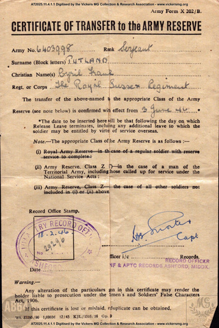 file Papers relating to Serjeant Putland (Royal Sussex Regiment) AT2025.11.4.1 1939-1945 https://www.patreon.com/posts/148837770/ item Army Form X202/B. Certificate of Transfer to the Army Reserve. War Office 6403998, Serjeant PUTLAND, Cyril Frank, The Royal Sussex Regiment AT2025.11.4.1.1 19460218 https://www.patreon.com/posts/148837770/ item Letter. Pension amount for injury from Gun Shot Wound. Ministry of Pensions CF Rutland, 1 Council Cottages, Brightling Rd, Robertsbridge, Sussex. AT2025.11.4.1.2 19490411 https://www.patreon.com/posts/148837770/