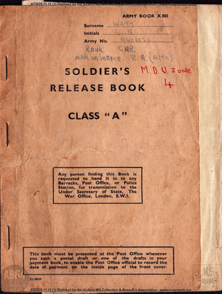 file Army Book X801. Soldier's Release Book. Class "A". War Office WATT, GN, 11408020, Royal Artillery (Anti-Tank) AT2025.11.12 19420226 19461102 https://www.patreon.com/posts/148839500/