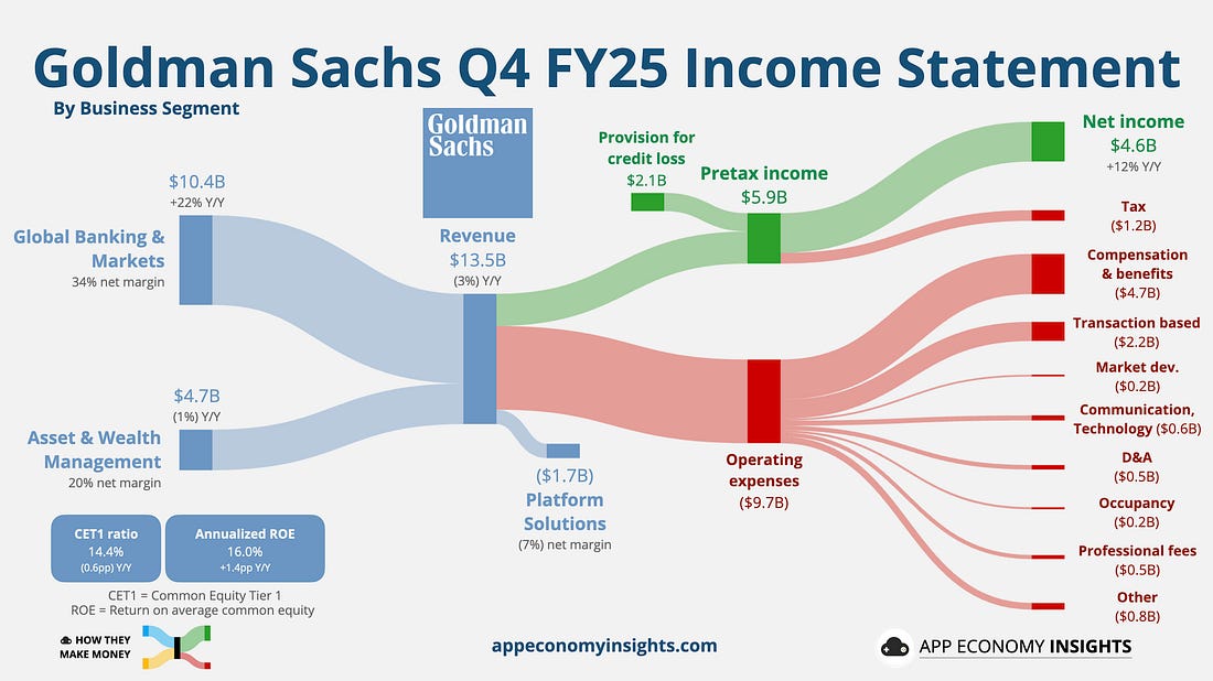 1. 🏛️ Goldman Sachs: Trading Desk RoarsGoldman Sachs delivered a noisy but ultimately bullish quarter. Revenue fell 3% Y/Y to $13.5 billion ($400 million miss), largely due to a $2.3 billion markdown tied to the Apple Card portfolio exit we discussed here. This caused the revenue from the Platform Solutions segment to turn negative in Q4.