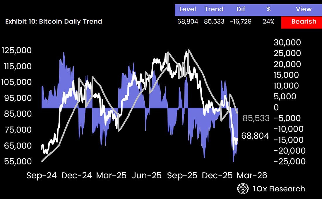10x Weekly Crypto Kickoff – Liquidity Is Quietly Leaving Crypto—Setting Up the Next Major MoveThe Week Ahead in Crypto Markets10x Weekly Crypto Kickoff – Liquidity Is Quietly Leaving Crypto—Setting Up the Next Major Move The report covers derivatives positioning, volatility trends, and funding dynamics across Bitcoin and Ethereum, along with sentiment, technical signals, ETF and stablecoin flows, option activity, expected trading ranges for the next 1–2 weeks, and key upcoming market catalysts. Why this report matters Crypto markets are at a critical turning point, with liquidity quietly leaving the system even as volatility and sentiment reach extreme levels. Traders are unwinding crash hedges, positioning is lighter, and volatility expectations are shifting—conditions that often precede major directional moves. At the same time, macro conditions are turning more favorable, but crypto has yet to respond, creating a disconnect that rarely persists for long. This report reveals what derivatives positioning, liquidity flows, and volatility signals suggest about whether the market is stabilizing or preparing for the next major move. Bitcoin - trend model: downtrend in place since $87,000, but for how long? Subscribe to 10x Research Market Updates to unlock the rest.Become a paying subscriber of 10x Research Market Updates to get access to this post and other subscriber-only content. A subscription gets you: