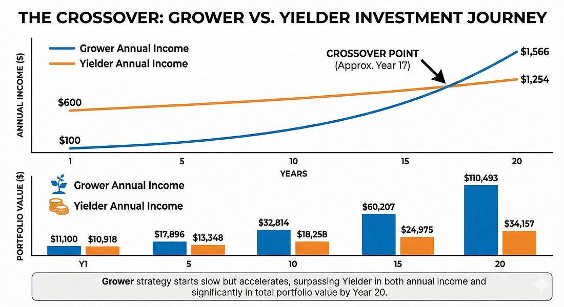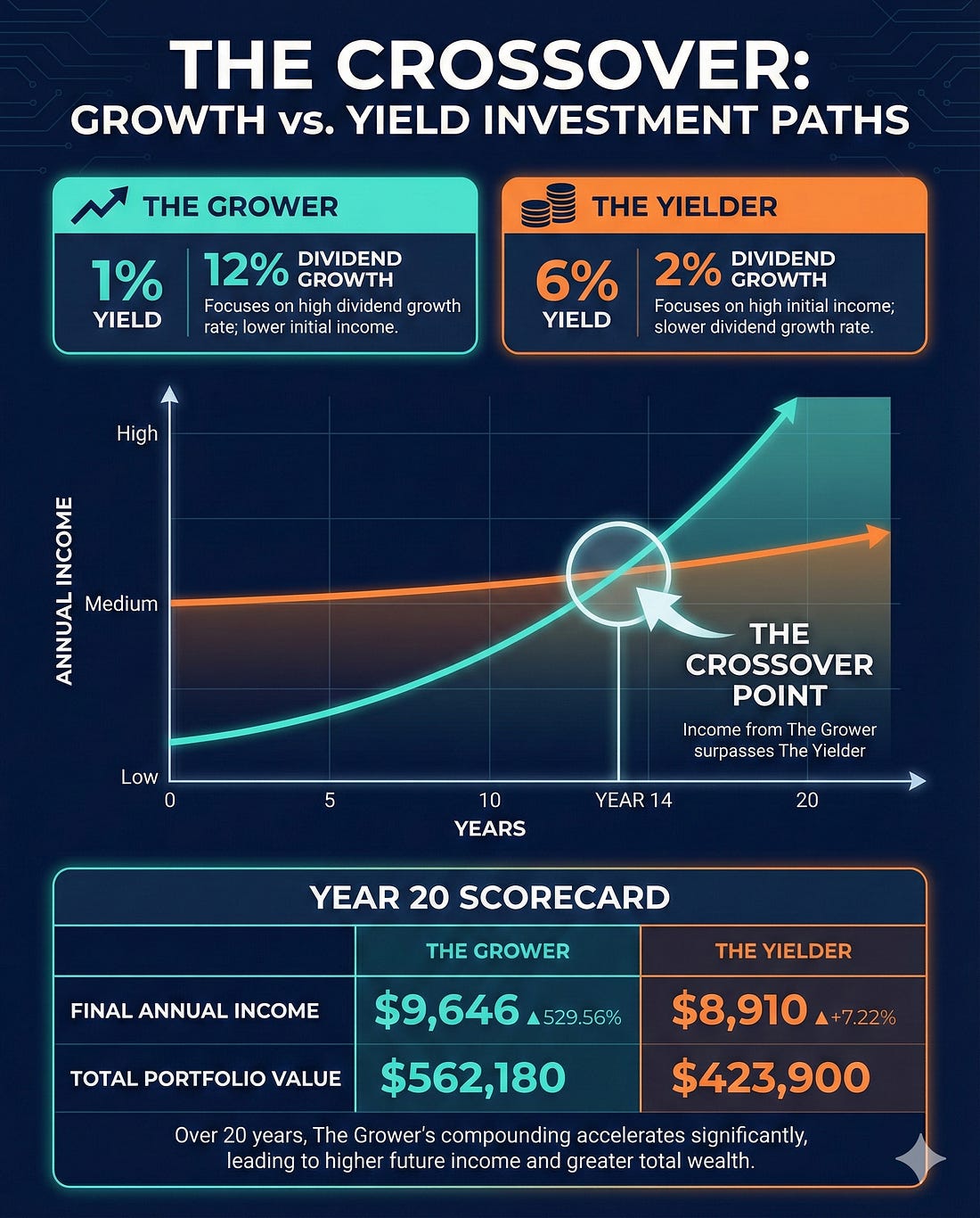 Two Philosophies, One GoalBefore we run the numbers, let’s define what we’re comparing. Dividend Growth Investing focuses on companies paying a modest yield today (often 0.5% to 2.5%) but increasing that dividend at high rates every year. Think Visa, Microsoft, or Costco. These companies retain most of their earnings to reinvest in the business, and the dividend grows with earnings. High-Yield Investing focuses on companies paying a large yield today (often 4% to 8%+). Think AT&T before its 2022 cut, or Altria. These companies distribute a large share of their earnings to shareholders because they have fewer high-return reinvestment opportunities. Both strategies aim to generate income and total returns. But they get there through very different engines, and that difference matters enormously over time. The key question is: would you rather have a big check today or a check that doubles every five to seven years? The Math: Modeling Two Portfolios Over 20 YearsLet’s build two hypothetical portfolios, each starting with a $10,000 investment and reinvesting all dividends. The assumptions are designed to reflect realistic company profiles for each category. Portfolio A: “The Grower”