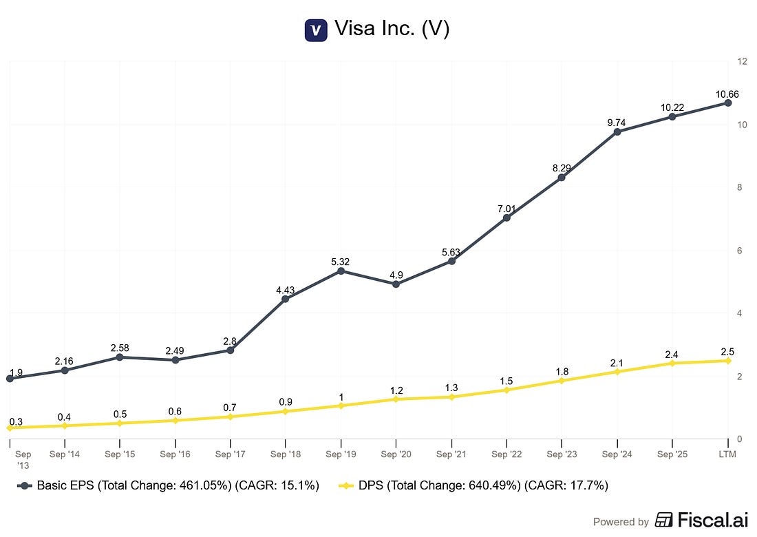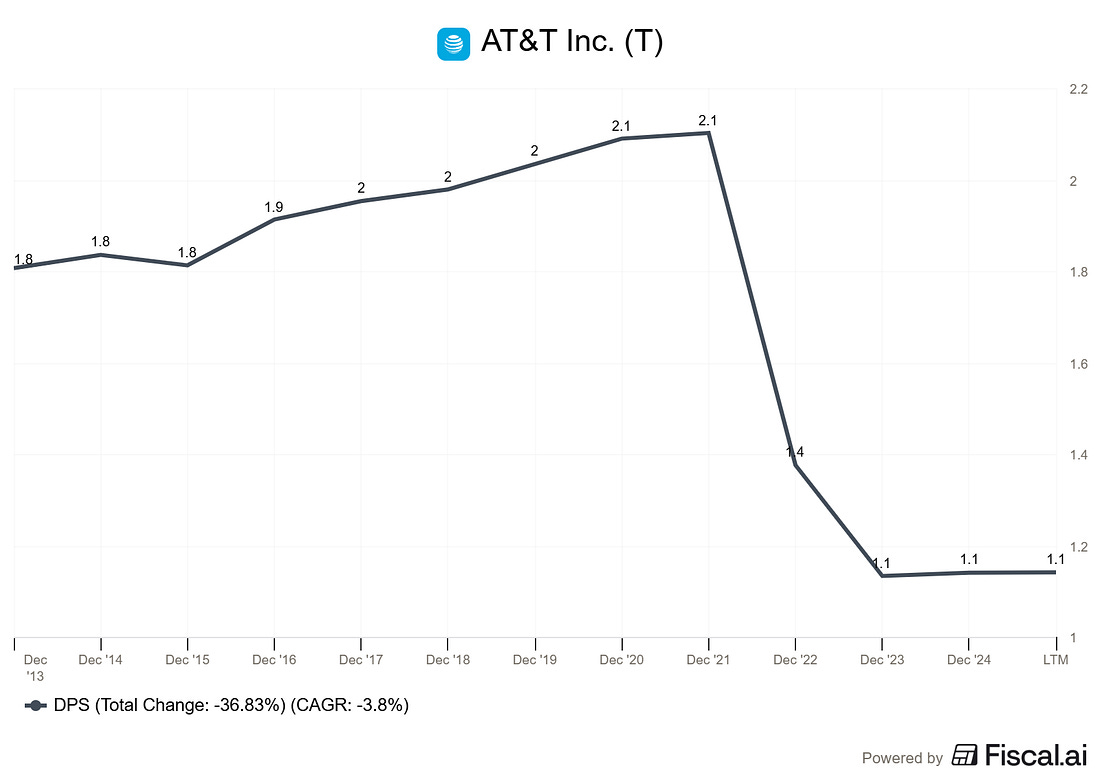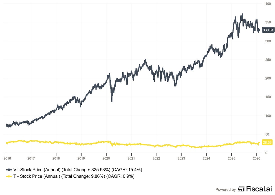 This mirrors a company like a pre-2022 AT&T or a mature utility, offering a fat yield with limited growth prospects and heavy capital requirements. Here’s what happens with reinvested dividends: Look at Year 1. The Yielder is throwing off $600 in annual income versus the Grower’s $100. That’s a 6x advantage. It feels like no contest. But by Year 10, the Grower’s annual income has nearly caught up to $384 versus $854. And by Year 15, the crossover starts to appear. By Year 20, the Grower is generating $1,566 in annual income compared to the Yielder’s $1,254. More importantly, look at the total portfolio values. The Grower’s portfolio has compounded to over $110,000 while the Yielder sits at roughly $34,000. That’s a 3x difference in total wealth, and the gap only widens from here. The crossover point for annual income typically occurs somewhere between Year 12 and Year 16, depending on the exact growth rates. But the crossover for total wealth? That happens much sooner, often by Year 5 or 6. This is the power of what I call the “dividend growth engine.” It’s the same principle Buffett saw in See’s Candies. See’s didn’t pay out everything. It retained earnings and generated ever-higher profits from a small capital base, which Buffett then redeployed into other investments. The compounding machine wasn’t the dividend. It was the growth of the earning power behind the dividend. Why High Yields Often Signal DangerA high yield isn’t always a gift. Sometimes it’s a warning. Dividend yield is a fraction. Yield equals the annual dividend divided by the share price. A yield can become “high” in two ways: the company raises its dividend (good), or the share price falls (bad). Many high-yield stocks carry elevated yields because the market is pricing in trouble. AT&T is the poster child for this lesson. For years, AT&T offered yields north of 7%, attracting income-hungry investors. But the company carried over $150 billion in debt (per AT&T’s fiscal year 2021 10-K), had limited growth prospects, and was struggling to maintain its payout. In 2022, AT&T cut its dividend by roughly 47% after spinning off its media business. Investors who bought for the yield got a painful lesson in sustainability. The warning signs were visible for years. AT&T’s payout ratio had ballooned above 60%, free cash flow barely covered the dividend, and the company’s ROIC was mediocre at best. As Buffett would categorize it, AT&T was a “Category 3” business: one that requires significant capital to grow but generates low returns on that capital. Compare that to Visa. According to recent data, Visa’s payout ratio is approximately 23%. The company retains nearly 77 cents of every dollar it earns and reinvests it at returns on invested capital north of 30%. That retained capital fuels earnings growth, which in turn fuels dividend growth, until it eventually overtakes the high-yielder. When evaluating any dividend stock, the payout ratio tells you how sustainable the dividend is and how much room the company has to grow it. A payout ratio under 50% with a strong ROIC gives you confidence that the dividend will keep climbing. A payout ratio above 70% with stagnant or declining earnings is a flashing yellow light. Real Company Case Studies: The Numbers Don’t LieLet’s move beyond hypotheticals and look at actual companies. I want to compare two real businesses to show how these dynamics play out in practice. Visa (V): The Dividend Growth Machine Visa is the ideal dividend-growth investment. Here’s what makes it special, drawn from its SEC filings and publicly available data: