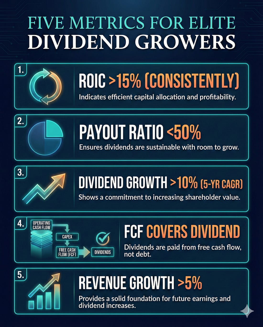 Visa has grown its dividend at a pace that doubles it roughly every 4 to 5 years. An investor who bought Visa ten years ago at a yield of roughly 0.7% is now earning a yield on cost (the dividend relative to their original purchase price) that far exceeds what most high-yield stocks offer today. This is possible because Visa is a capital-light business. It doesn’t manufacture anything. It doesn’t carry inventory. It operates a payment network that processes trillions of dollars in transactions annually and takes a small fee on each one. As discussed in our earlier piece on how payment processing works, the credit card network sits at the center of every transaction, earning fees on volume without requiring significant capital. That capital efficiency is the engine. Low capital requirements imply a high ROIC, enabling the company to grow earnings rapidly while still increasing its dividend by double digits each year. AT&T (T): The Yield Trap AT&T tells the opposite story. For decades, AT&T attracted income investors with yields between 5% and 7%. But the underlying business couldn’t support that generosity forever. According to AT&T’s fiscal year 2022 10-K, the company carried total debt of approximately $154.7 billion (including $7.6 billion in short-term debt, $128.4 billion in long-term debt, and $18.7 billion in leases). Interest expense for fiscal year 2022 was $6.1 billion, money that goes to creditors before shareholders see a dime. AT&T’s debt burden, combined with massive capital expenditure requirements for 5G and fiber buildouts, left little room for error. When the company spun off its media assets in 2022, it slashed the annual dividend from $2.08 per share to $1.11. Investors who had been collecting that fat yield suddenly saw their income cut nearly in half. The lesson: AT&T was using Buffett’s “Category 3” playbook. It required enormous capital to operate (billions in annual capex), generated modest returns on that capital, and funded its dividend partly through debt. That’s not a sustainable combination. Today, AT&T yields roughly 4% with a more sustainable payout ratio. It may be a fine income investment going forward. But investors who bought a decade ago for the high yield have underperformed the S&P 500 on a total return basis by a wide margin. Five Metrics to Identify Elite Dividend GrowersNot every low-yield stock is a future compounder. You need a framework to separate the real growers from the pretenders. Here are the five metrics I look for: 1. ROIC Above 15% (Consistently) Return on invested capital measures how efficiently a company converts its invested capital into profits. A company with a ROIC above 25%, such as Visa or Microsoft, has a fundamentally different economic engine than one with an 8% ROIC. A high ROIC means the company creates more value per dollar retained, which directly fuels dividend growth. Look for consistency here. A single year of high ROIC can be a fluke. Five to ten years of sustained ROIC above 15% signals a real competitive advantage. 2. Payout Ratio Below 50% A low payout ratio indicates the company is retaining most of its earnings for reinvestment. This gives the dividend two benefits: safety (there’s a buffer if earnings dip temporarily) and growth potential (retained earnings fuel future profit growth). Visa’s payout ratio of roughly 23% means the company could double its dividend tomorrow and still retain half its earnings. That’s an enormous runway. 3. Dividend Growth Rate Above 10% (5-Year CAGR) The growth rate of the dividend tells you how quickly your income stream is compounding. At 10% growth, your dividend doubles every 7.2 years. At 15% growth, it doubles every 4.8 years. At 20% growth, it doubles every 3.6 years. Look at the 5-year compound annual growth rate to smooth out any one-year anomalies. Companies such as Visa (approximately 15% CAGR), Microsoft (approximately 10% CAGR), and Costco (approximately 10% CAGR) have demonstrated sustained double-digit dividend growth. 4. Free Cash Flow Comfortably Covers the Dividend Earnings can be manipulated through accounting choices. Free cash flow is harder to fake. The dividend should be well-covered by free cash flow, not just reported earnings. I want to see the free cash flow payout ratio (dividends paid divided by free cash flow) below 40% for the strongest growers. This confirms that the company generates real cash to fund the dividend and still has ample capacity for reinvestment, acquisitions, or buybacks. 5. Revenue Growth of at Least 5% Annually Dividend growth ultimately comes from earnings growth, and earnings growth comes from revenue growth (combined with margin expansion or share buybacks). A company with stagnant revenue will eventually hit a ceiling on how fast it can grow its dividend. Look for companies with a clear path to continued revenue growth through new products, geographic expansion, or secular tailwinds. Visa benefits from the global shift toward digital payments. Microsoft benefits from cloud adoption. These aren’t one-time boosts but multi-decade trends. Building Your Dividend Growth WatchlistPutting this all together, here’s a framework for building a watchlist of potential dividend growth investments: Step 1: Screen for quality. Start with companies that have raised their dividend for at least 5 consecutive years, have ROIC above 15%, and payout ratios below 50%. Step 2: Check the growth engine. Look at the 5-year dividend growth CAGR. Is it above 10%? Is it accelerating or decelerating? A slowing growth rate may signal that the best days are behind it. Step 3: Verify with free cash flow. Pull the company’s 10-K from sec.gov and check that free cash flow (operating cash flow minus capital expenditures) comfortably exceeds dividend payments. If the company is borrowing to fund dividends, move on. Step 4: Assess the runway. Does the company operate in a growing market? Is there room to expand margins or enter new mar