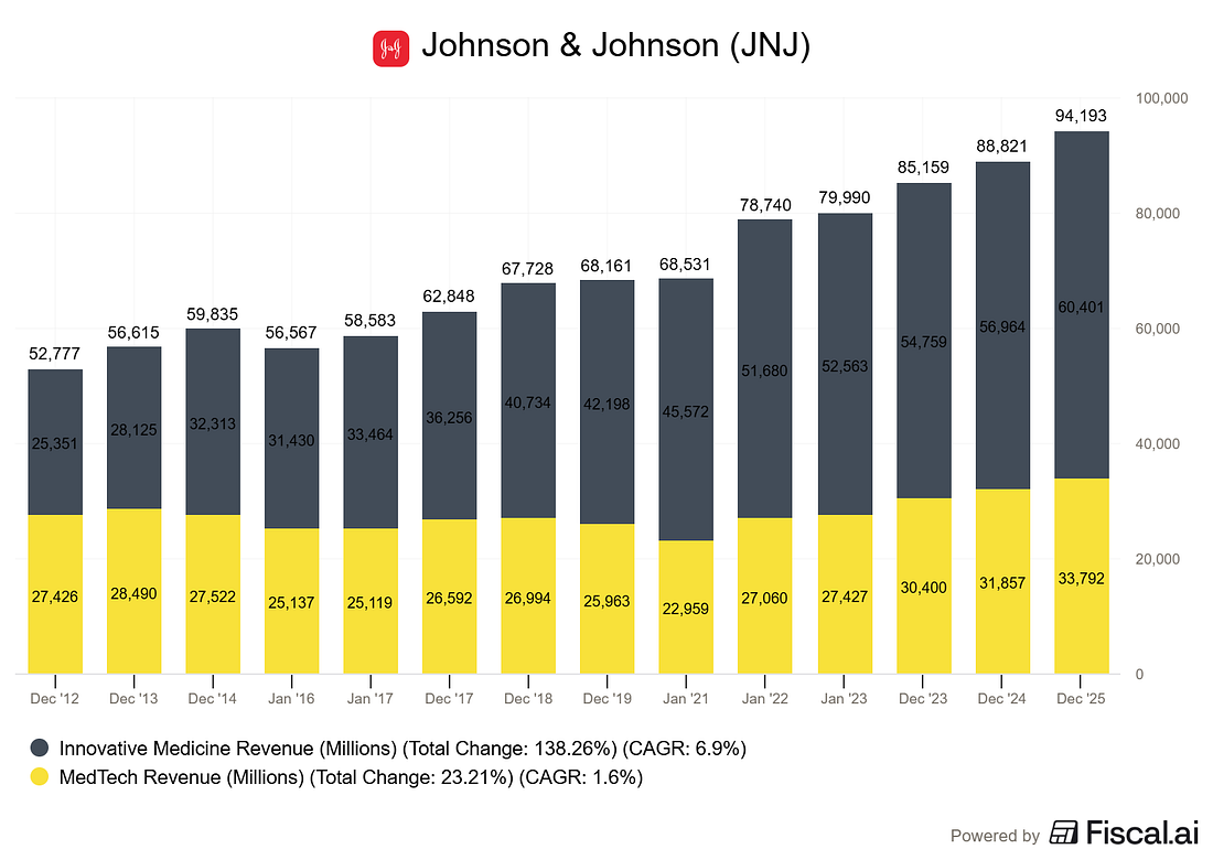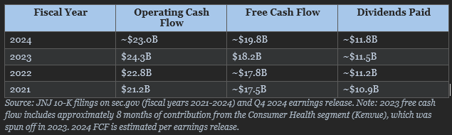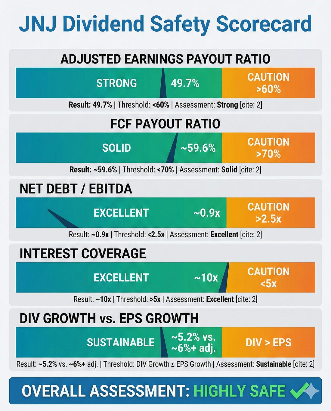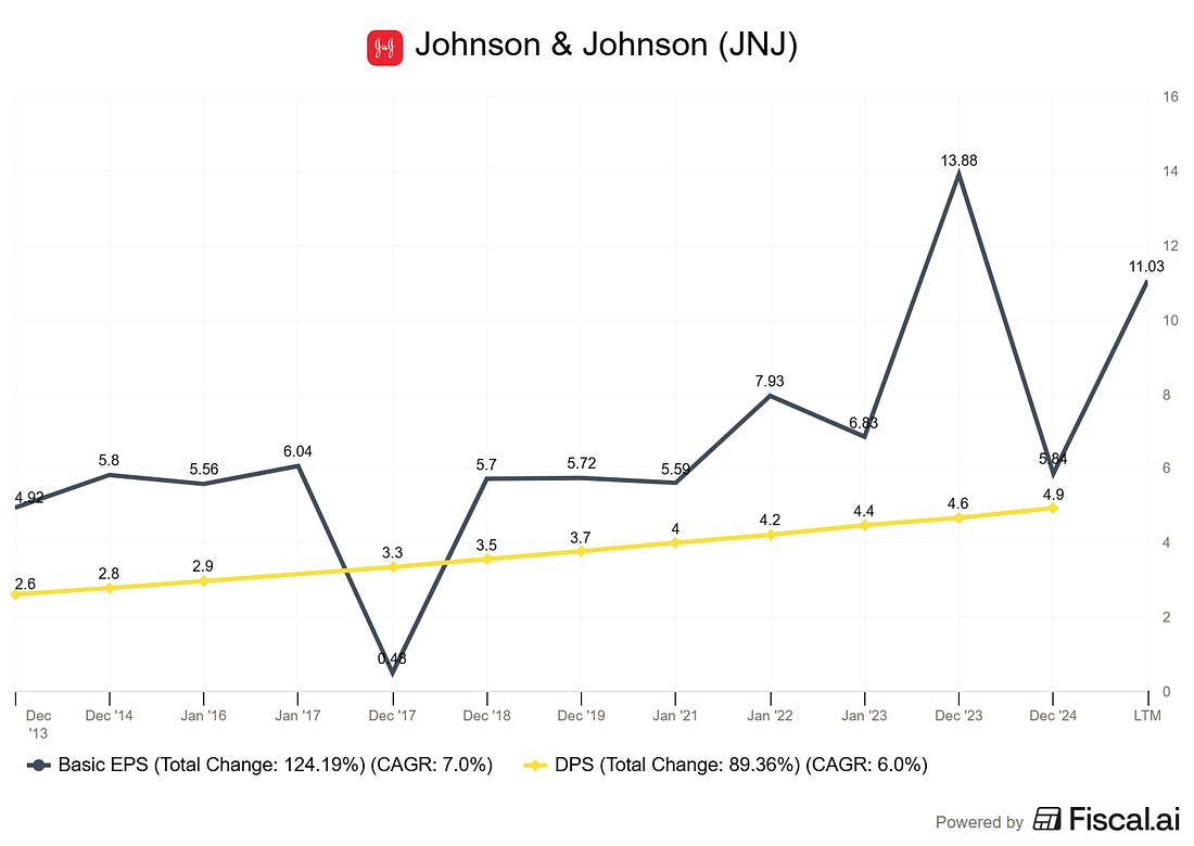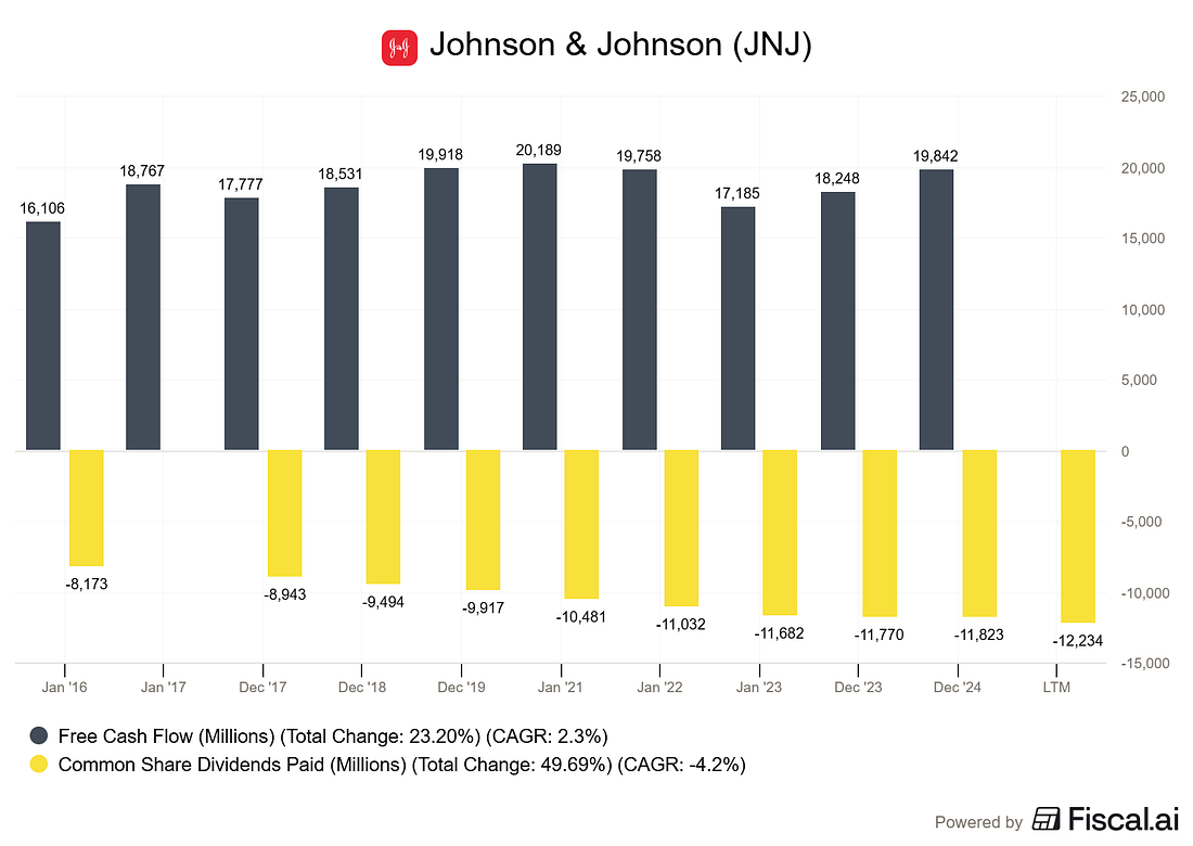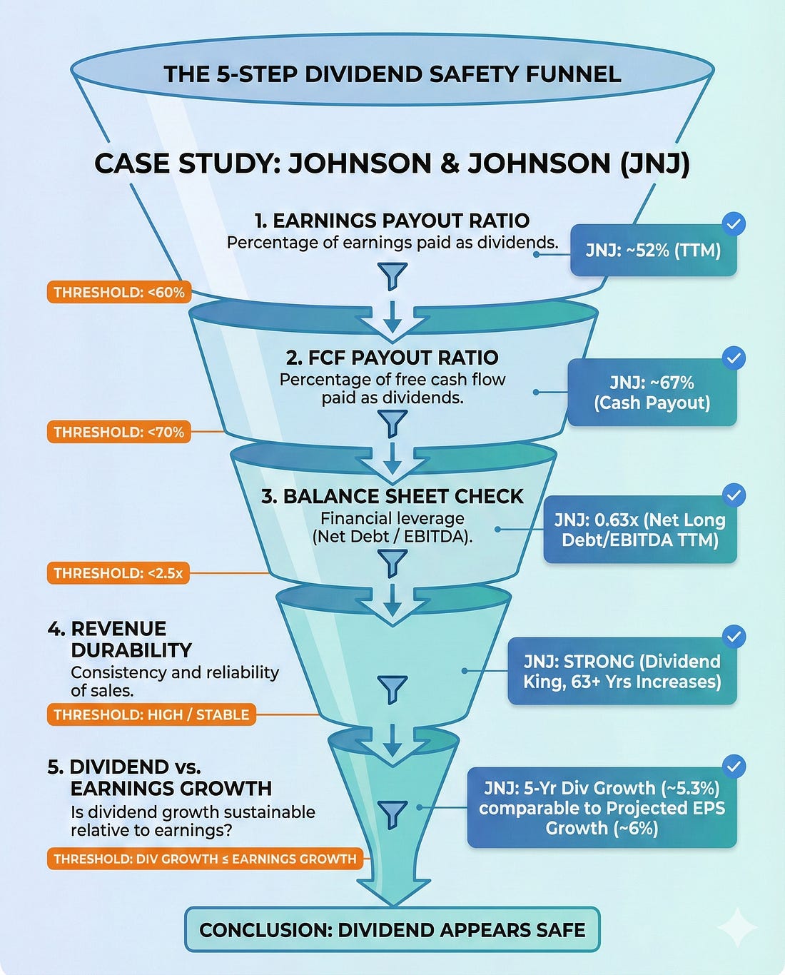 How to Evaluate Dividend Safety Using Financial StatementsA Five-Step Framework with Johnson & Johnson (JNJ) as Our Case StudyJohnson & Johnson has increased its dividend for 62 consecutive years. That is a streak stretching back to 1963, through recessions, wars, pandemics, and everything in between. But here is the question every dividend investor should ask: does the streak tell you the dividend is safe today, or just that it was safe yesterday? A long dividend track record is comforting. It is not, however, a guarantee. Companies like General Electric and AT&T once seemed like untouchable dividend payers, and both eventually cut their dividends. The track record only tells you the past. Financial statements tell you the future. In today’s post, I’m going to walk you through a five-step framework for evaluating dividend safety using a company’s financial statements. We will use Johnson & Johnson (JNJ) as our case study, pulling actual numbers from their fiscal year 2024 10-K filed with the SEC in February 2025. By the end, you will have a repeatable process you can apply to any dividend stock in your portfolio. Here is what we will cover: • Step 1: Start with the Earnings Payout Ratio • Step 2: Upgrade to the Free Cash Flow Payout Ratio • Step 3: Examine the Balance Sheet for Debt Safety • Step 4: Assess Revenue Durability and Earnings Trends • Step 5: Check the Dividend Growth Rate Against Earnings Growth • Common Mistakes: What This Framework Cannot Tell You Why Dividend Safety Matters More Than YieldBefore we dig into the framework, I want to address something important. Too many investors chase the highest yield without asking whether the company can actually sustain it. A 7% yield sounds wonderful until the company slashes it by 50% and the stock drops 30% overnight. Dividend safety is about one core question: can the company comfortably afford to pay (and grow) its current dividend from the cash its operations generate? If the answer is yes, you likely have a quality dividend stock. If the answer is no, or barely, you are sitting on a ticking clock. Warren Buffett put it simply in his 1992 shareholder letter: the best business is one that can employ large amounts of capital at high rates of return. Companies that generate strong returns on capital have the surplus cash needed to pay reliable, growing dividends without straining the business. With that context, let’s build our framework. Step 1: Start with the Earnings Payout RatioThe earnings payout ratio is the simplest place to begin. It tells you what percentage of a company’s net earnings are being paid out as dividends. Formula: Earnings Payout Ratio = Dividends Per Share / Earnings Per Share Let’s run this for JNJ using their fiscal 2024 results, which you can find in their 10-K filing on sec.gov (filed February 13, 2025, for the period ending December 29, 2024). Johnson & Johnson reported GAAP diluted earnings per share of $5.79 for fiscal 2024. Their annual dividend was $4.96 per share ($1.24 per quarter). That gives us: Earnings Payout Ratio = $4.96 / $5.79 = 85.7% At first glance, that 85.7% payout ratio looks alarmingly high. If JNJ is paying out almost 86 cents of every dollar it earns, there is almost no cushion, right? Not so fast. This is where many investors make their first mistake. GAAP net earnings for fiscal 2024 were heavily impacted by one-time charges, including approximately $1.6 billion in acquired in-process research and development (IPR&D) charges from acquisitions throughout the year. These are non-cash charges that reduce reported earnings but do not affect the company’s cash generation ability. JNJ’s adjusted earnings per share, which strips out these special items plus intangible amortization, came in at $9.98 for fiscal 2024. Using adjusted EPS: Adjusted Earnings Payout Ratio = $4.96 / $9.98 = 49.7% That is a much more comfortable picture. A payout ratio under 50% on adjusted earnings means JNJ is retaining about half its earnings for reinvestment, debt repayment, and acquisitions. What to look for: I generally want to see an earnings payout ratio below 60% for mature companies and below 40% for growth companies. Above 75%, you should start asking tough questions. But always dig deeper than GAAP earnings, which brings us to Step 2. Step 2: Upgrade to the Free Cash Flow Payout RatioEarnings are an accounting construct. Cash is real. That is why the free cash flow payout ratio is the more important metric for dividend safety. Formula: FCF Payout Ratio = Total Dividends Paid / Free Cash Flow Free cash flow equals operating cash flow minus capital expenditures. It represents the actual cash left over after the company has funded its operations and maintained its asset base. This is the cash available to pay dividends, buy back shares, reduce debt, or make acquisitions. For JNJ’s fiscal 2024, the company reported estimated free cash flow of approximately $19.8 billion, according to their Q4 2024 earnings release. Their total dividend payments for the year were approximately $11.8 billion (based on approximately 2.41 billion shares outstanding at $4.96 per share). FCF Payout Ratio = $11.8 billion / $19.8 billion = 59.6% A free cash flow payout ratio around 60% is solid for a company of JNJ’s size and maturity. It means the company is generating nearly $8 billion in excess cash after paying dividends. That cash cushion provides flexibility for acquisitions (JNJ spent heavily on acquisitions in 2024, including Shockwave Medical and V-Wave), debt management, and continued R&D investment. Let’s put this in context by looking at JNJ’s free cash flow history: The pattern here is reassuring. JNJ consistently generates enough free cash flow to cover its dividend payments with a meaningful buffer. Even in a year of heavy acquisition spending, operating cash flow remains robust. What to look for: I want the free cash flow payout ratio below 70% for stable companies and below 50