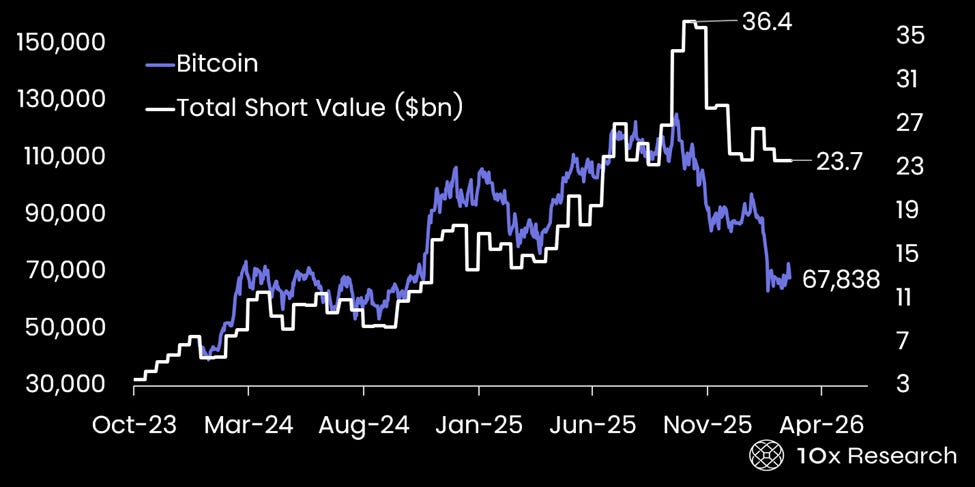 Why this report matters Shares of stablecoin issuer Circle have rallied more than 80% in less than three weeks since we highlighted the potential for a short-covering squeeze around the earnings release in our February 20 report. Updated short-interest data, typically published 7–10 days after the settlement date, shows that hedge funds had already begun reducing some of their positions ahead of the catalyst, after short exposure reached 17.8% of the public float. Even so, short interest remained substantial at the time of the earnings release, totaling roughly $1.3 billion, implying that hedge funds likely incurred close to $1 billion in mark-to-market losses as the stock rallied. As we outlined in our earlier analysis, we expected short covering to provide a powerful tailwind for shares of crypto equities, with these equities outperforming Bitcoin. This makes it worthwhile to take a closer look at the scale of hedge-fund short positioning across the broader crypto-equity universe. It may come as a surprise that another crypto/Bitcoin proxy trade structure currently looks highly compelling. While it may not offer the same explosive upside as the recent Circle trade, the risk-reward profile remains attractive. Importantly, the structure provides a built-in buffer against downside risk, making it particularly well-suited for the current market environment. Bitcoin (LHS) vs. value of short positions against crypto equities (RHS, $bn) Subscribe to 10x Research Market Updates to unlock the rest.Become a paying subscriber of 10x Research Market Updates to get access to this post and other subscriber-only content. A subscription gets you: